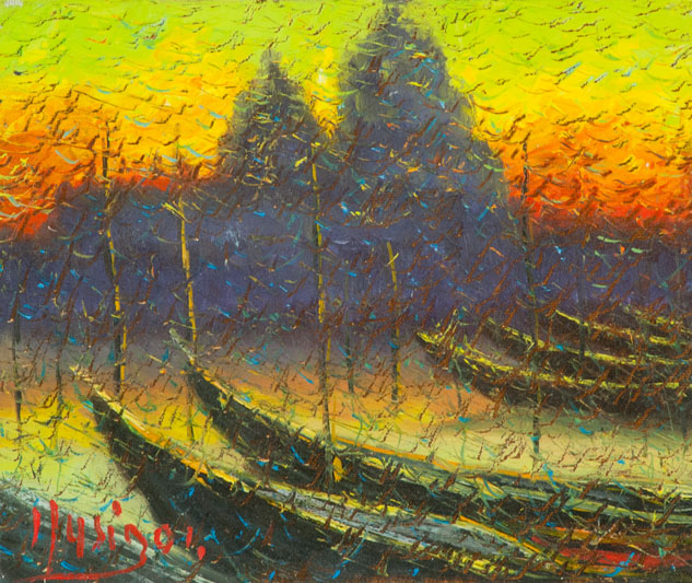 Roberto Masia Tramonto veneziano, 2001 Olio su tela, cm. 25x30 Firmato in basso a sinistra. Sul verso: scritto di Autenticità dell'Artista; Etichetta di Autenticità dell'Artista.