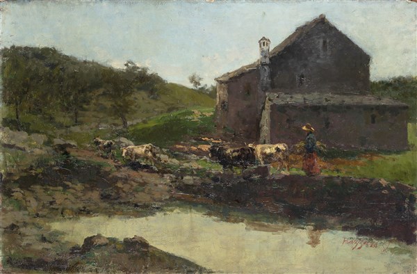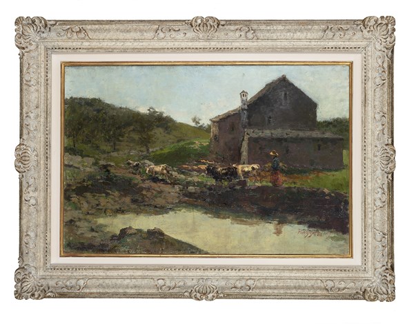 Leonardo Bazzaro "Al pascolo" olio su compensato (cm 48x74,5) Firmato in basso