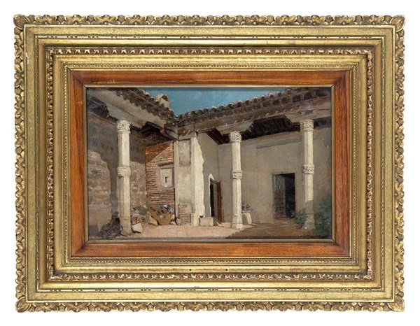 Alberto Pasini "Nel tempio" olio su tavola (cm 18x29) Tracce di firma in basso