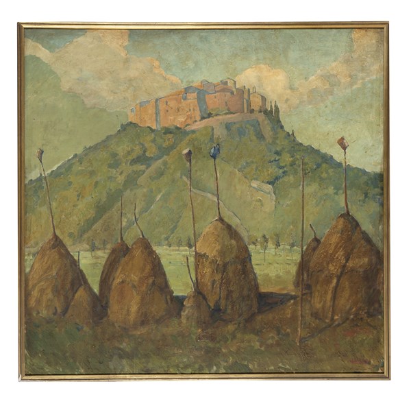 Luigi Zago "La rocca sul colle" olio su compensato (cm 90x95) Firmato in basso