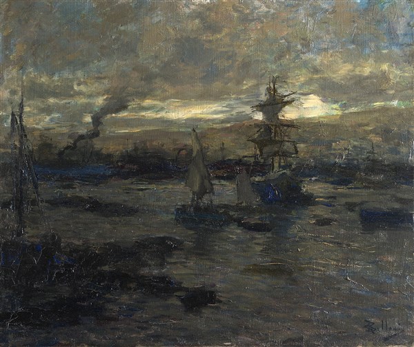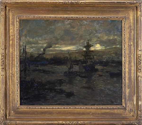 Giorgio Belloni "Sera nel porto" olio su compensato (cm 50x60) Firmato in basso