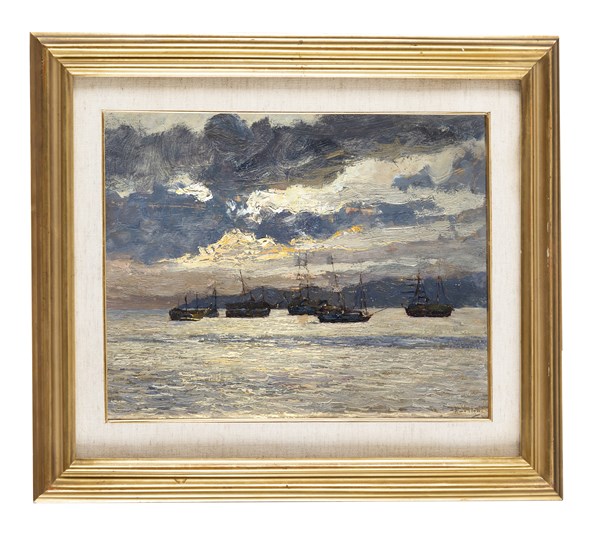 Giorgio Belloni "Marina con barche" olio su tavola (cm 25,5x36) Firmato in bass