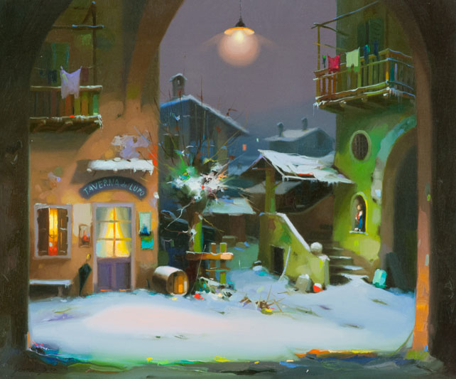 Silvano Gamba Borgo fantastico, 1977 Olio su tela, cm. 50x60 Firma e data in basso a sinistra. Sul verso: firma, data e titolo; Etichetta di Autenticità.