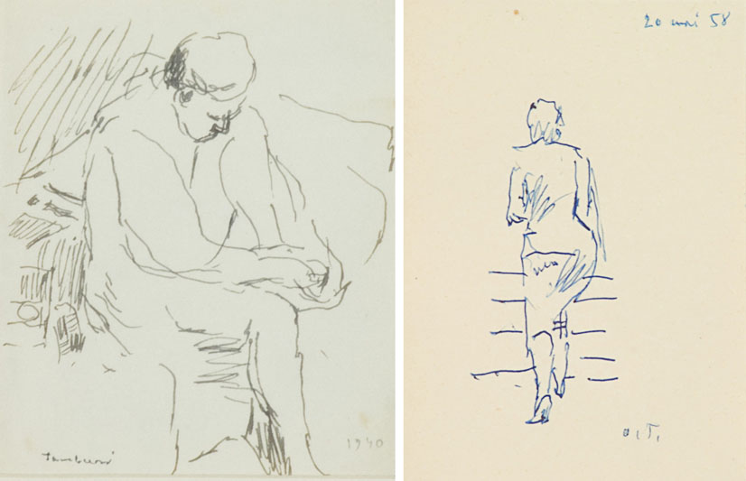 Orfeo Tamburi Lotto unico di due Opere - "Figura seduta", 1940, China su carta, cm. 13x12, firma in basso a sinistra, data in basso a destra, Autentica dell'Artista su foto; - "Figura", 1958, China su carta, cm. 12,5x8,5, sigla in basso a destra, data in alto a destra, Autentica dell'Artista su foto.