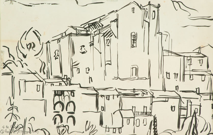 Dilvo Lotti Paesaggio China su carta, cm. 33x49 La carta presenta fioriture. Firma e dedica a persona in basso a sinistra. Sul verso: altro disegno a china.