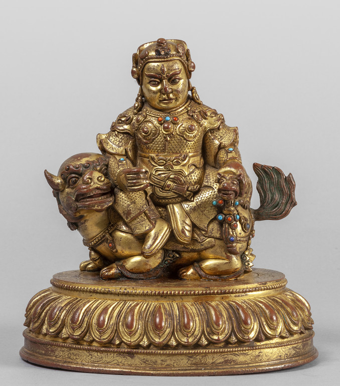 Divinità guerriera seduta su cane di Phò scultura in bronzo dorato Cina sec.XIX