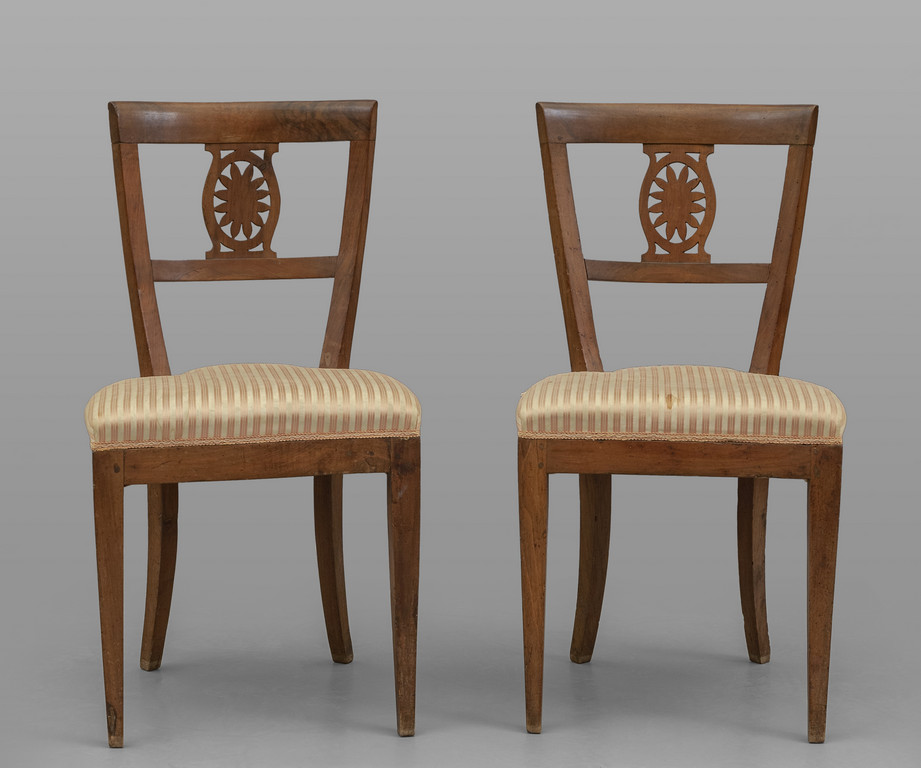 Precedente Lotto 0835 Successivo Aste Boetto - Via Mura dello Zerbino 10R, 16122 Genova Aste di Antiquariato e Arte Orientale Asta di Antiquariato e Arte Orientale giovedì 10 giugno 2021 ore 14:00 (UTC +01:00) SEDIE Coppia di sedie Carlo X in noce schienale intagliato sec.XIX