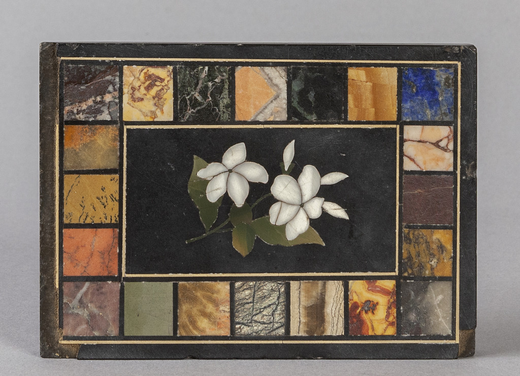 Presse papier intarsiato con marmi vari con al centro fiore sec.XIX