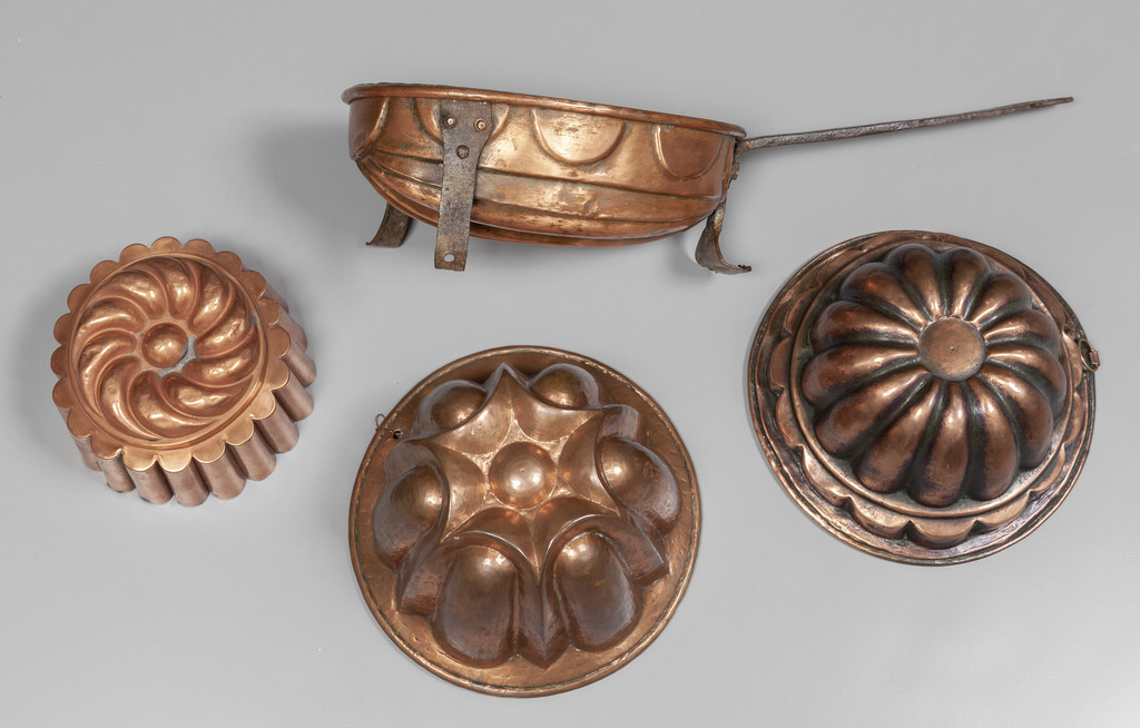 Quattro antichi stampi da budino in arme di varie forme e misure di cui uno con manico