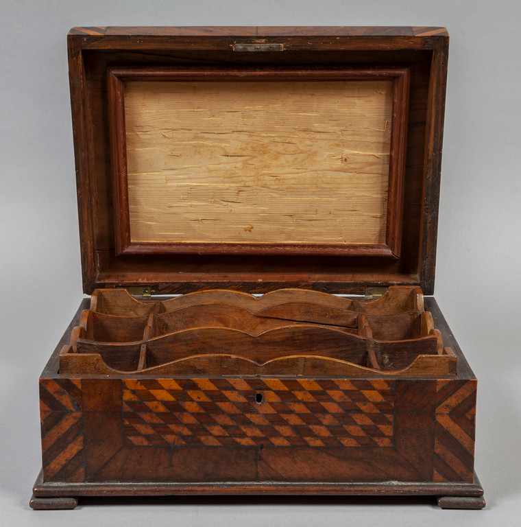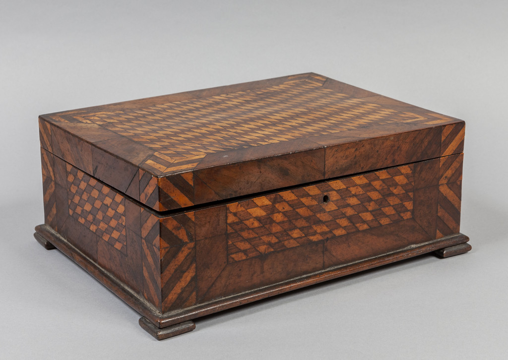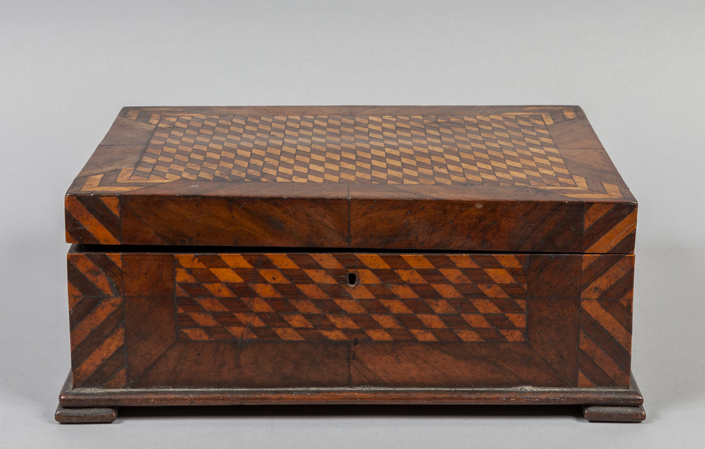 Scatola in legno finemente lastronata a dadi sec.XIX