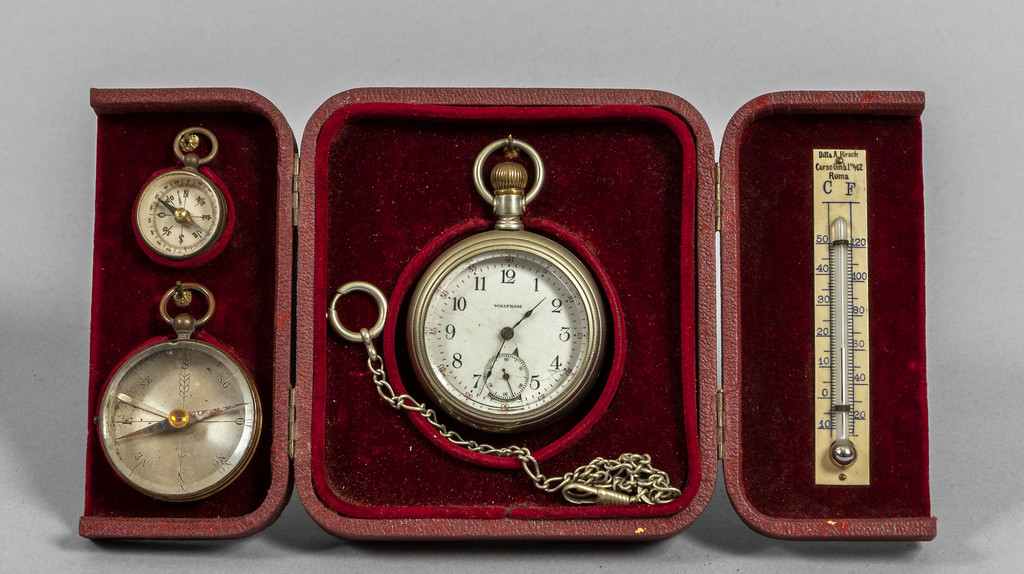 Set da viaggio composto da orologio due bussole e termometro ditta A.Hirsch C.so Umberto Roma