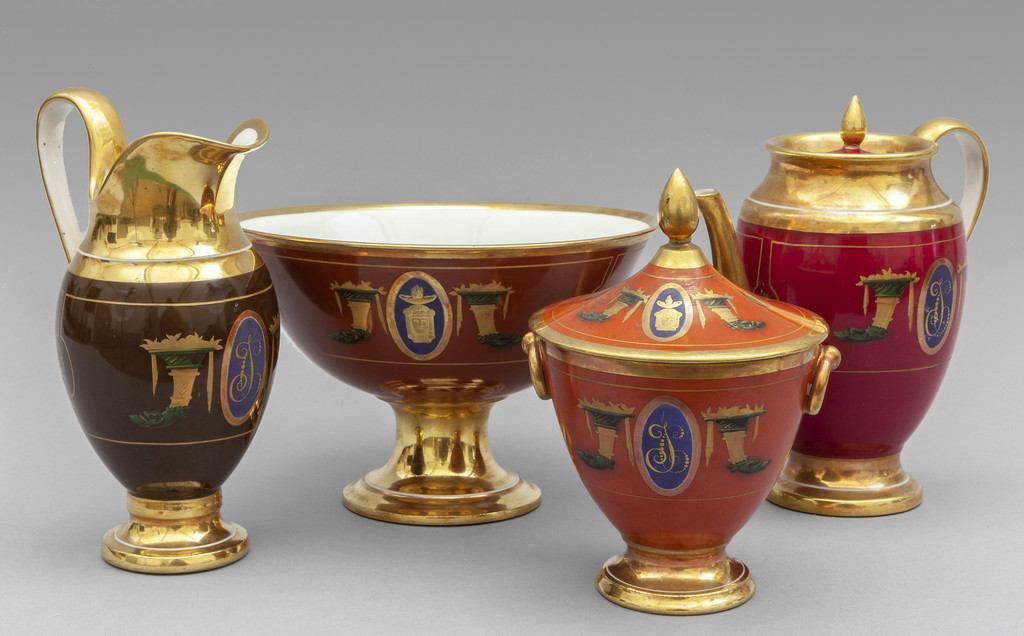Quattro pezzi da servizio Impero in porcellana policroma decorata in oro con cornucopie Francia sec.XIX