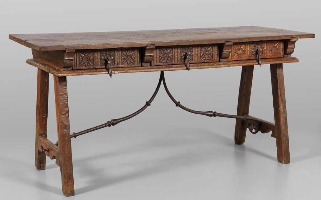 Tavolo a fratina in noce tre cassetti nella fascia ferri d'epoca sec.XVII