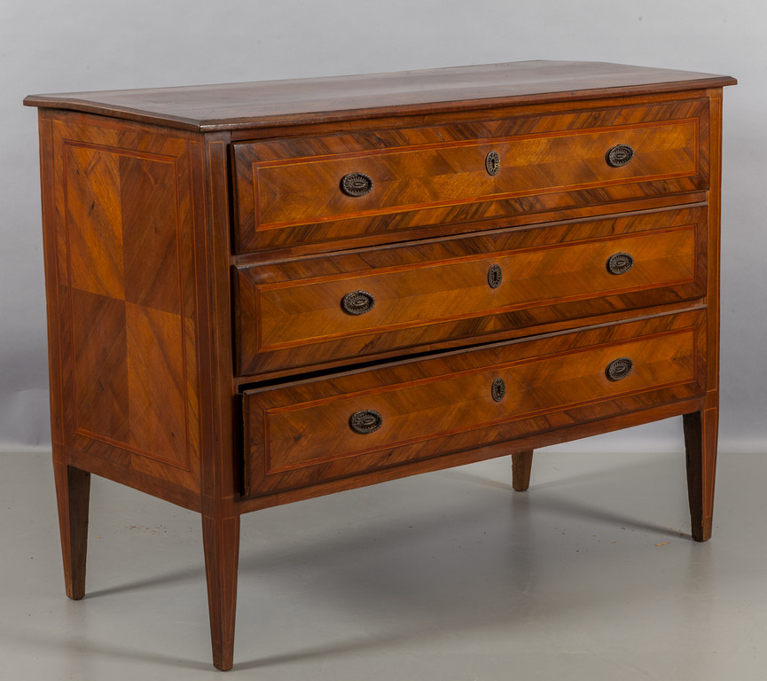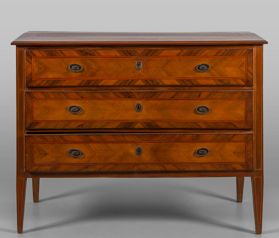 Comò in stile Luigi XVI a tre cassetti lastronato in palissandro filettato in bois de rose sec.XIX