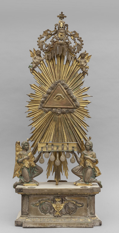 Piedistallo in legno laccato e metallo dorato con angeli laterali sec.XIX