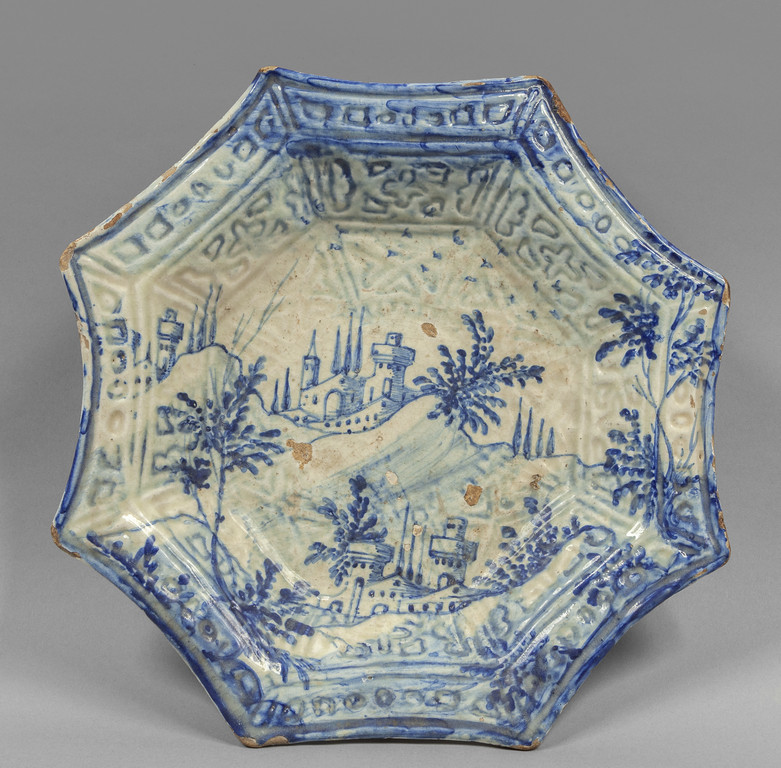 Grande piatto ottagonale decorato a paesaggi in blu su fondo bianco Italia Meridionale sec.XVIII
