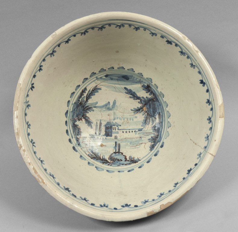 Grande catino in ceramica decorato con paesaggio in blu su fondo bianco Italia Meridionale sec.XVIII