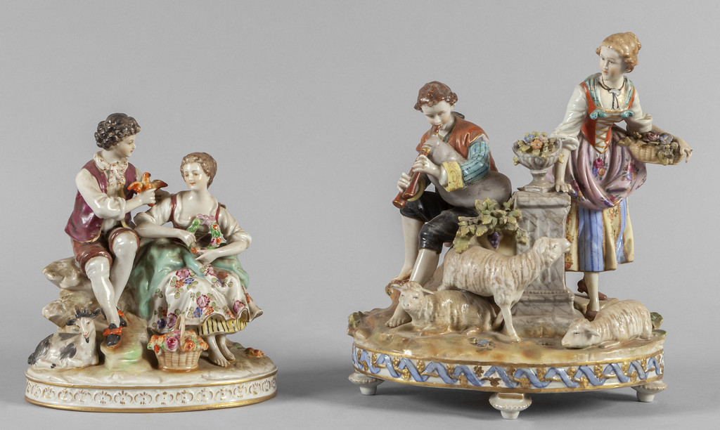 Due grandi gruppi in porcellana policroma a soggetti bucolici