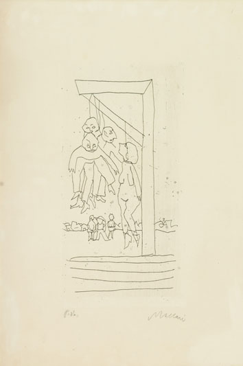 Mino Maccari Impiccati Acquaforte di cm. 32,5x17, su carta di cm. 50x35, es. P.A. Firma in basso a destra, tiratura in basso a sinistra.