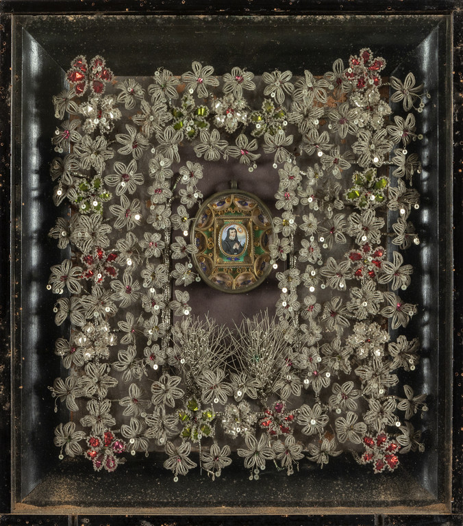 Cornice contenente reliquario con fiori costruiti con perline di vetro sec.XIX