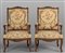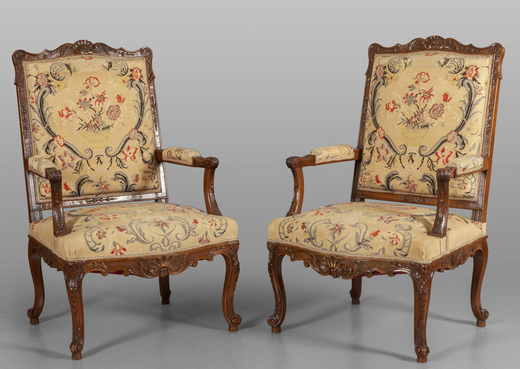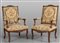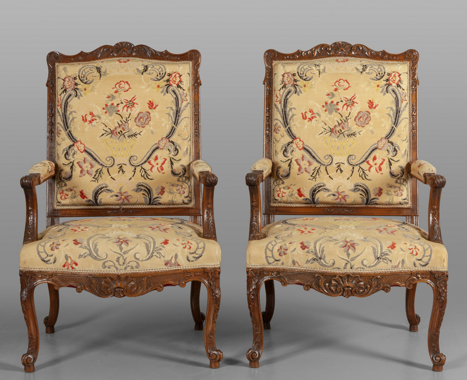 Coppia di poltrone in stile Luigi XIV in noce con stoffa a fiori Francia sec.XIX