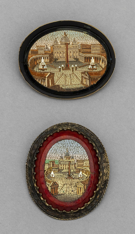 Spilla in micromosaico raffigurante Piazza San Pietro sec.XIX (cm.4x3 5) e spilla in micromosaico sec.XIX (cm.3x4)
