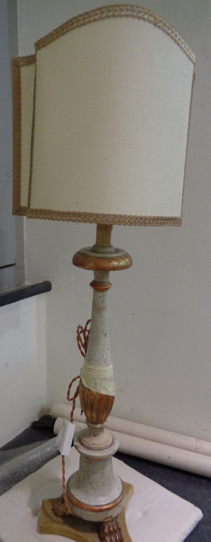 Candeliere Luigi XVI in legno intagliato laccato e dorato a tutto tondo adattato a lampada sec.XVIII