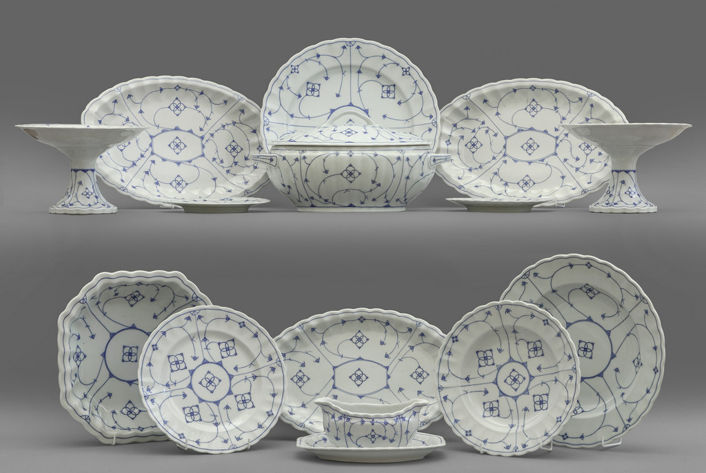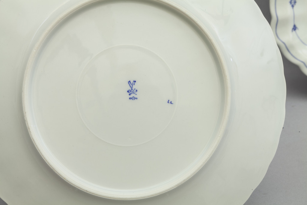 Servizio di piatti in porcellana di Delft bianca e blu composto da 36 piatti piani 12 fondi 11 frutta 2 alzate 1 zuppiera e 4 piatti da portata