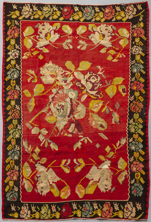 Grande tappeto a fondo rosso con decorazione a rose e bordo scuro s.to A.LK sec.XX