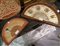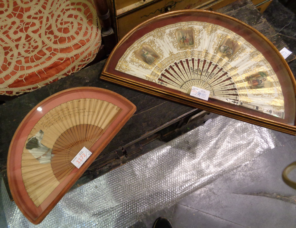 Ventaglio dipinto a soggetti teatrali su fondo bianco ed oro con stecche in avorio colorato sec.XIX(h.cm.26) e ventaglio d.to 1917 decorato con profilo di cane da caccia (h.cm.19)