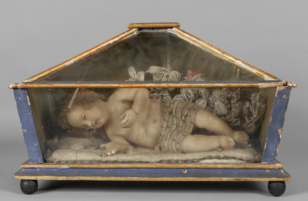 Teca in legno dipinto contenente scultura in cera raffigurante Bambin Gesù sec.XIX