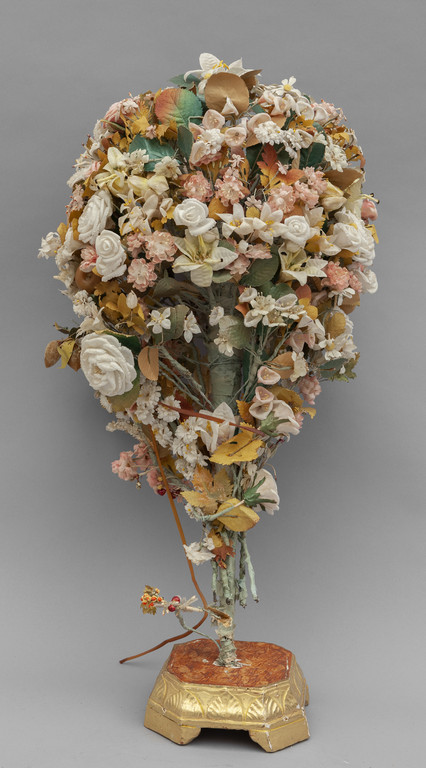 Composizione floreale poggiante su base in legno Carlo X