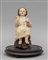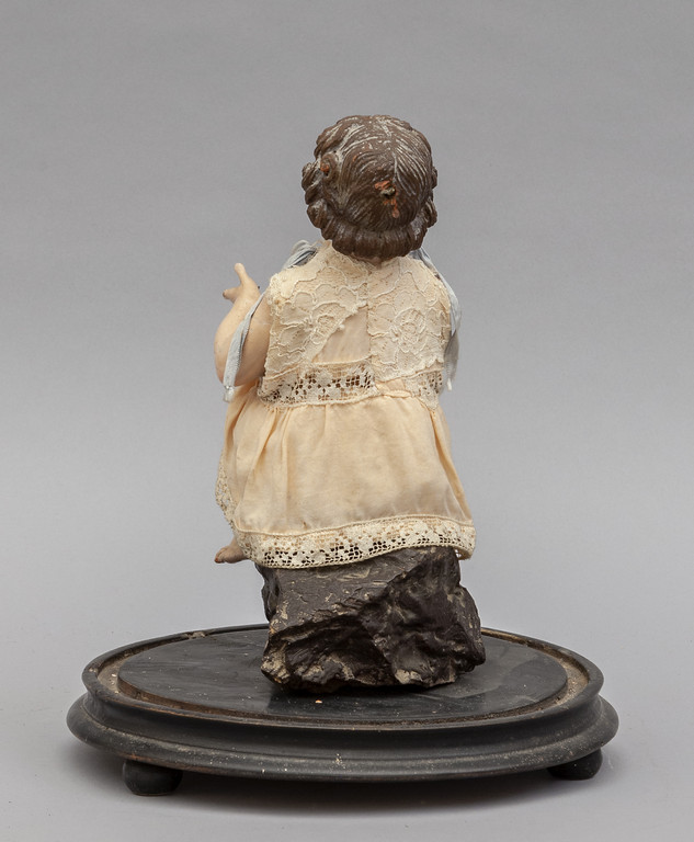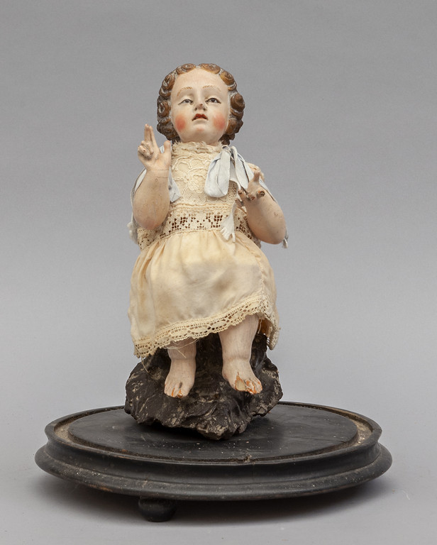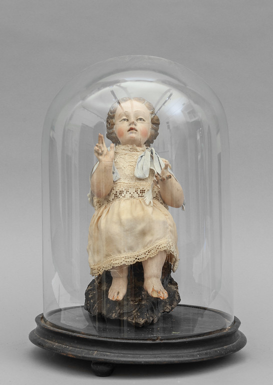 Bambin Gesù scultura in legno policroma occhi in vetro sec.XIX dentro campana in vetro