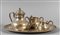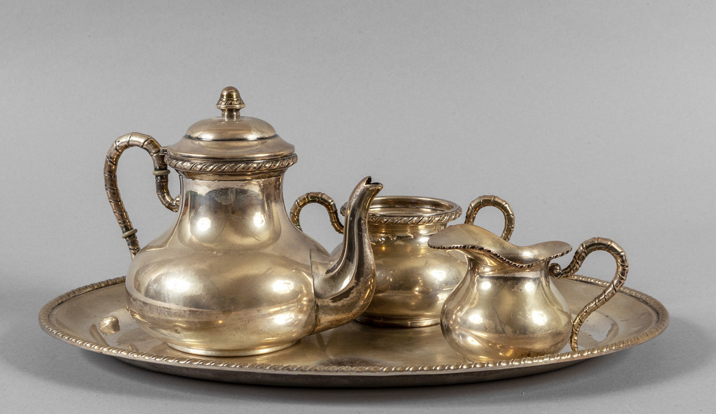 Vassoio ovale in argento e servizio da thè (tre pezzi manca coperchio zuccheriera)