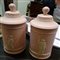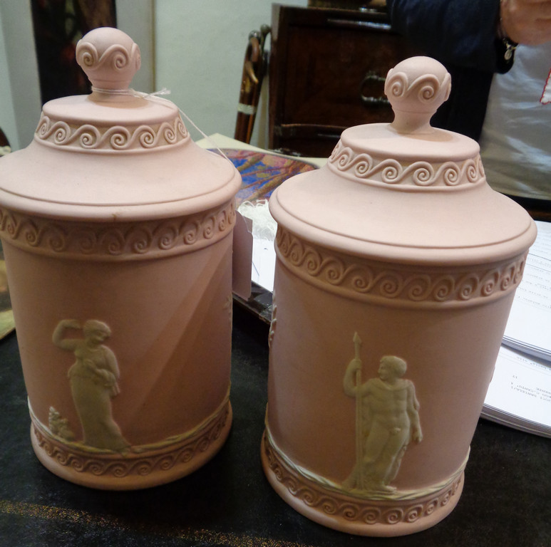 Coppia di vasi cilindrici con coperchio decorati con figure neoclassiche a rilievo in bianco e rosa
