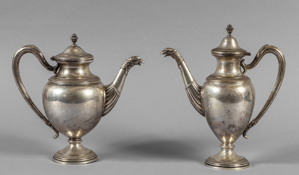Cioccolatiera e theiera in argento bordo decorato con palmette