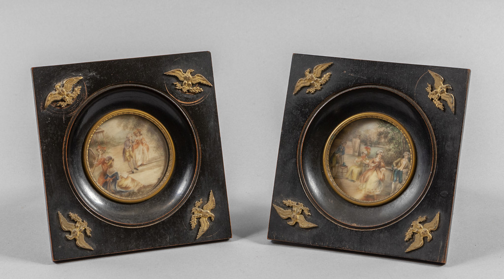 Coppia di miniature raffiguranti feste in giardino cornicette in legno ebanizzato con aquile in bronzo dorato nei quattro angoli