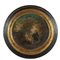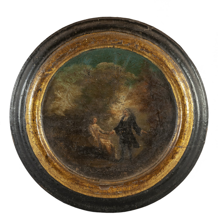Medaglione in legno cornice ebanizzata e dorata all'interno dipinto raffigurante una scena romantica