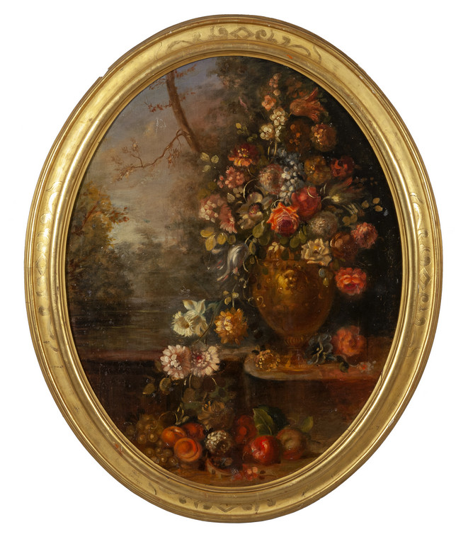 'Vaso di fiori in un paesaggio' olio di forma ovale cornice in legno intagliato e bulinato