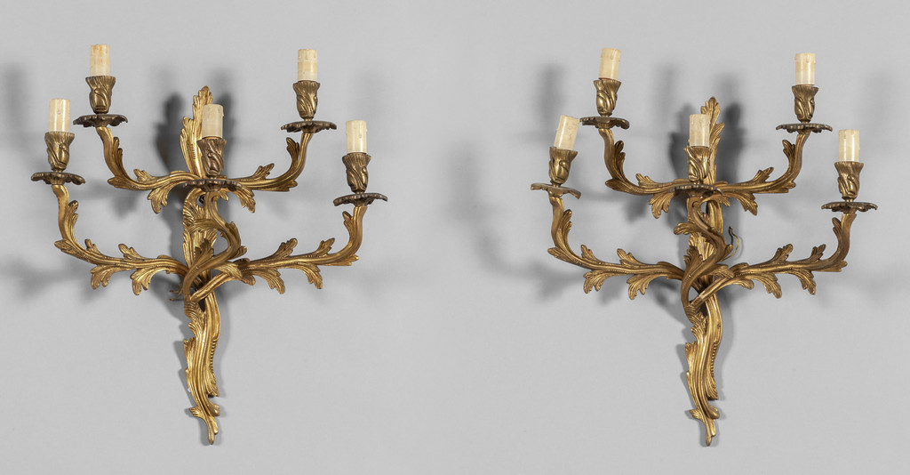 Coppia di apliques in stile Luigi XV in bronzo dorato a 5 bracci