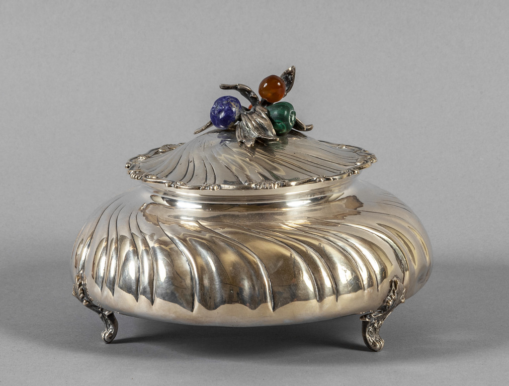 Scatola in argento sbalzato presa con frutti in pietre dure