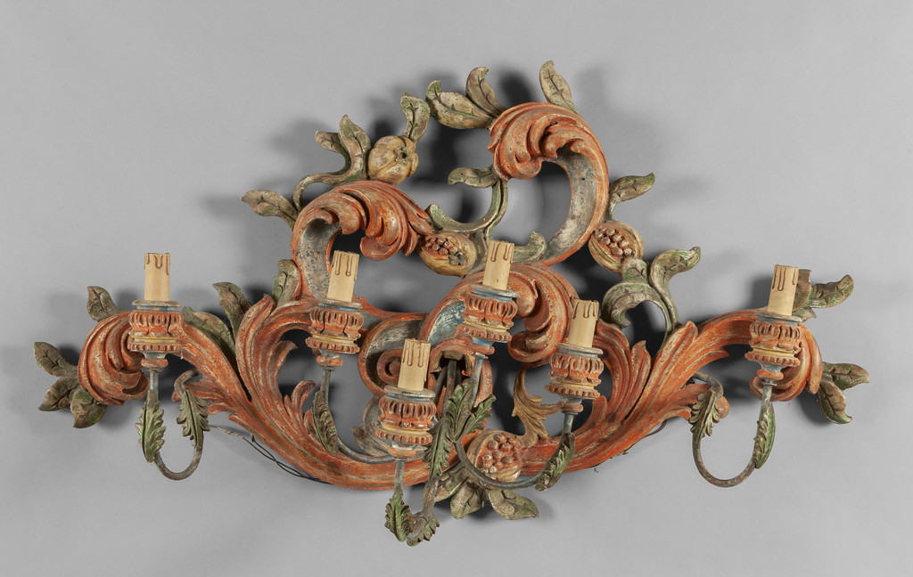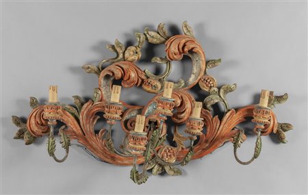Grande apliques in legno intagliato e laccato in policromia a sei luci