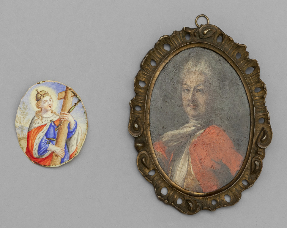 'Gentiluomo con abito rosso' olio su rame e 'Santa con Crocefisso' tempera su pergamena