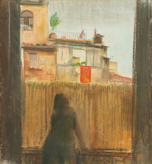 Romano Stefanelli Figura alla finestra, 1964 Tecnica mista su cartoncino, cm. 33,5x30 Firma e data in basso a destra.