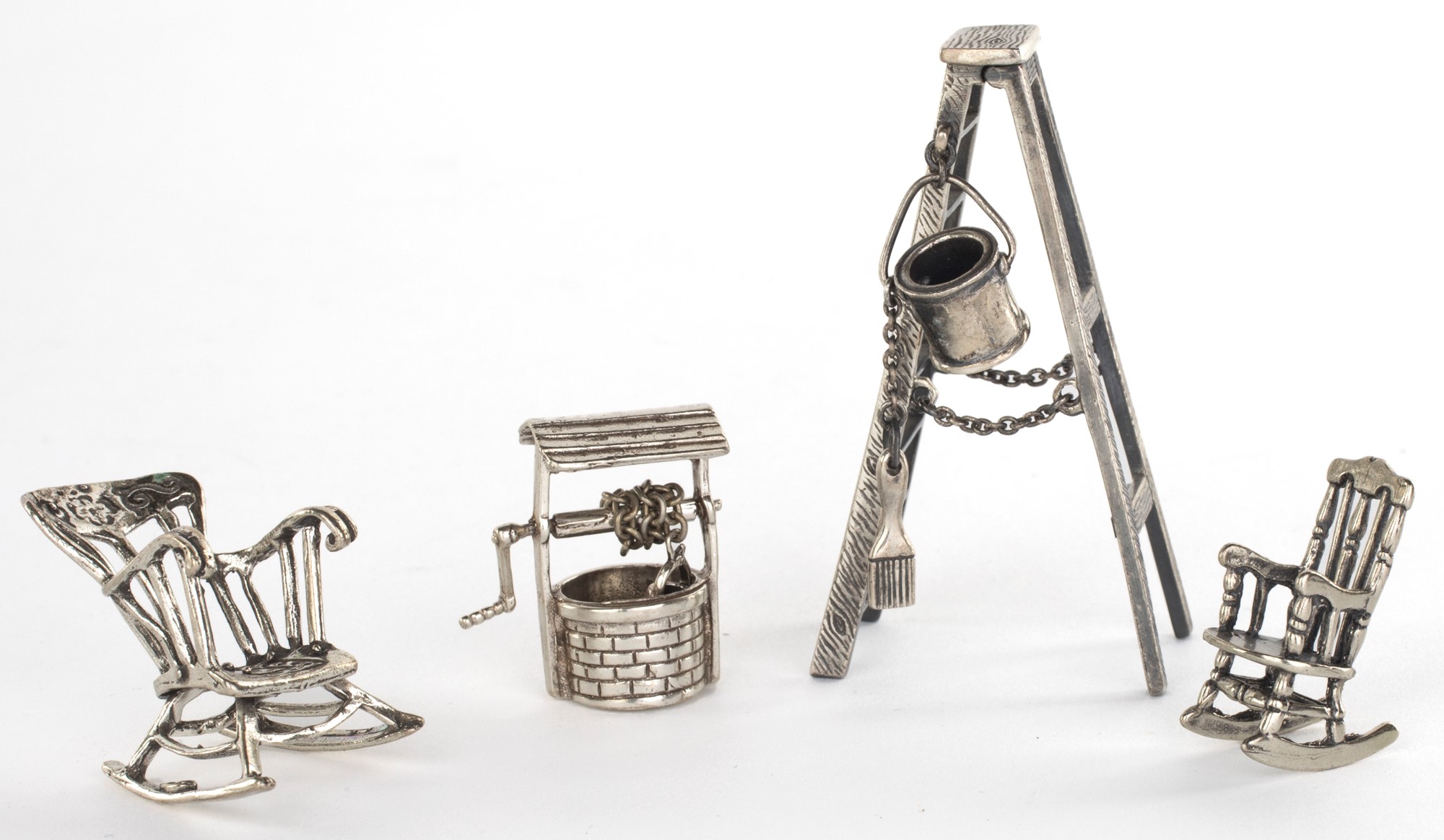 Lotto composto da quattro miniature in argento una scala a libretto con secchio e pennello, un pozzo, due sedie a dondolo, misure diverse - gr. 72
