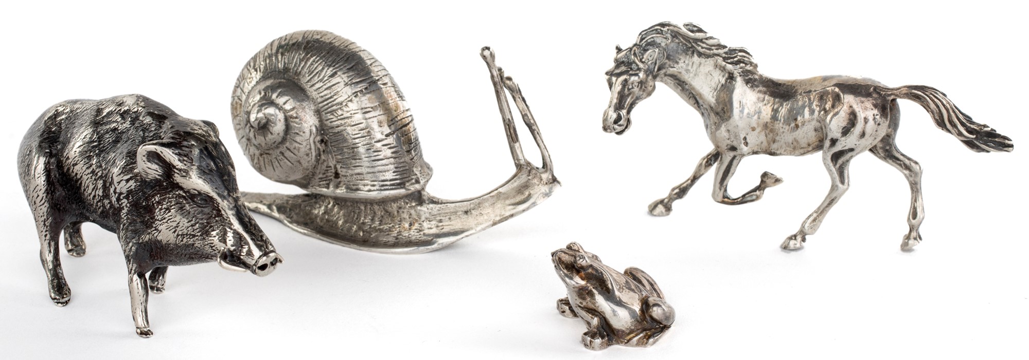 Lotto composto da quattro animali in miniatura in argento cinghiale, lumaca, cavallo e un ranocchio, misure diverse - gr. 318