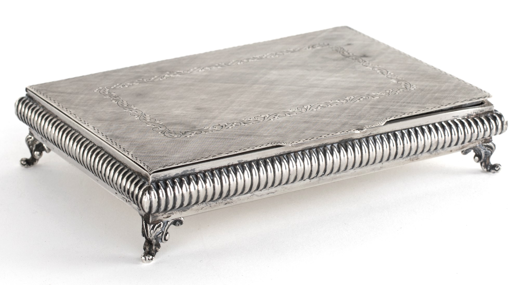 Scatola in argento di forma rettangolare con fascia bombata baccellata, coperchio incernierato a superficie zigrinata decorata da una cornice a volute incise, piedi angolari fitomorfi, 3x14x10 - gr. 170