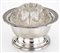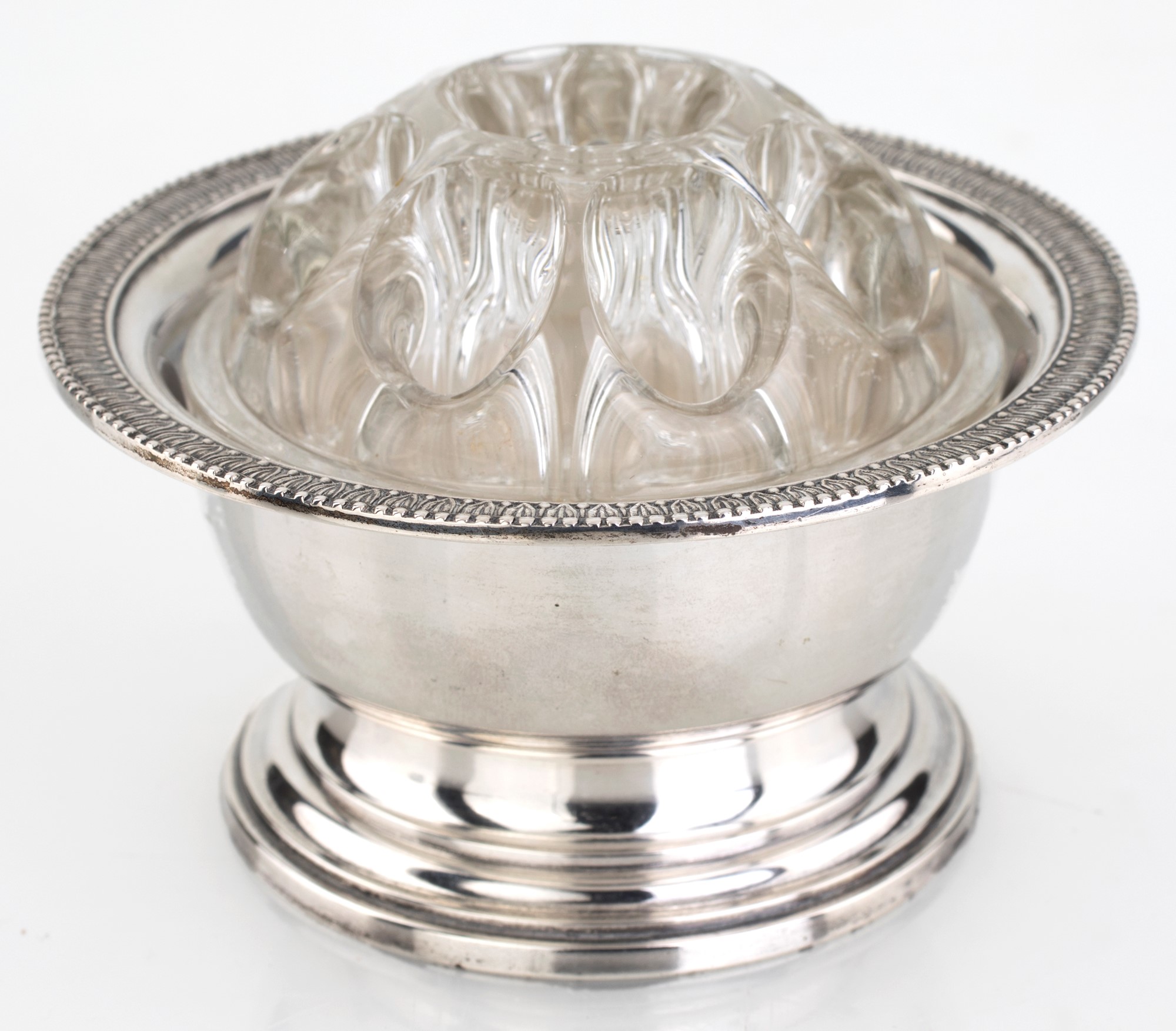 Portafiori in argento e cristallo a forma di coppetta su piede circolare con profilo cesellato a palmette, contenente una sfera traforata per inserire i fiori, 5x10 - gr. 73