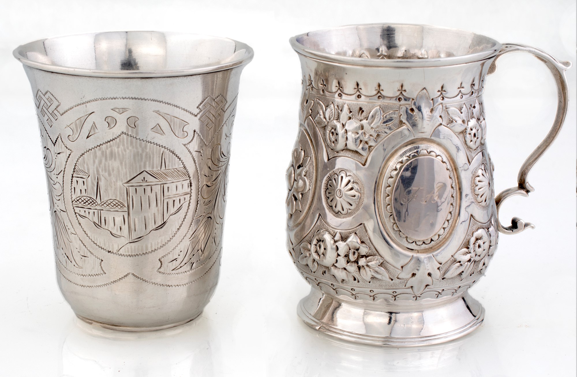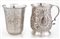 Lotto composto da due bicchieri in argento un piccolo boccale inglese con decorazione sbalzata a fiori e manico sagomato ed un bicchierino di analoga misura con decorazione incisa, altezza cm 8 - gr. 178