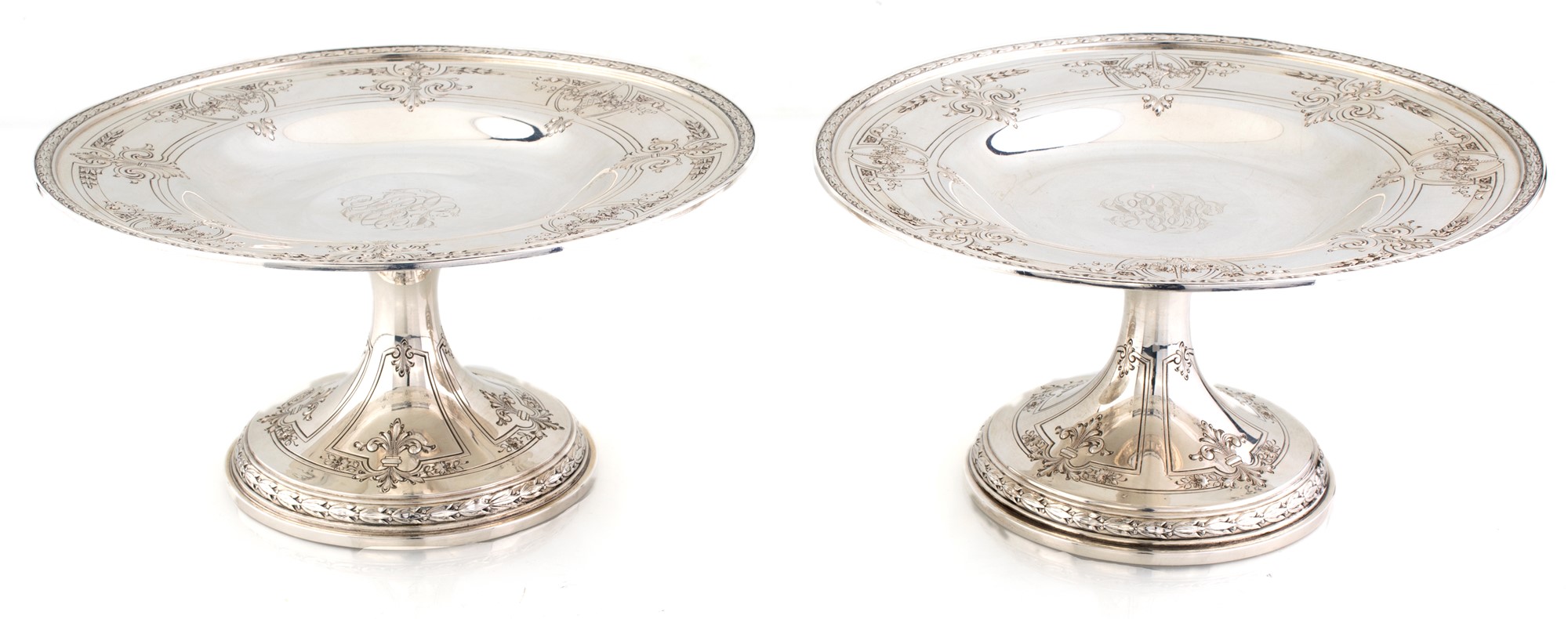 Coppia di alzatine in argento sterling, Hardy & Hayes co. decorate da cesti con fiori sospesi tra volute e motivi vegetali incisi, 9,5x19 - gr. 772